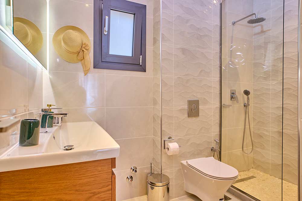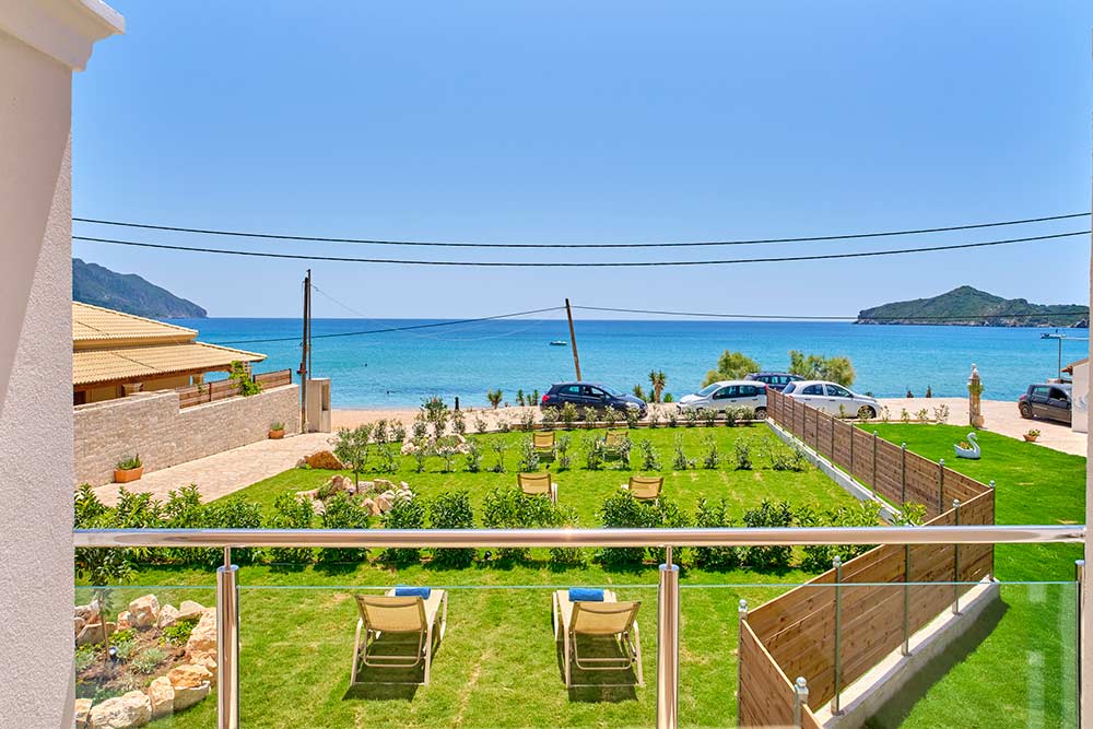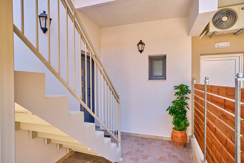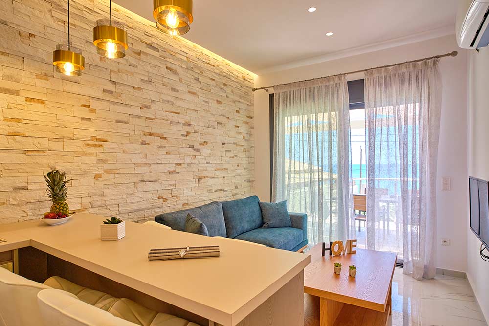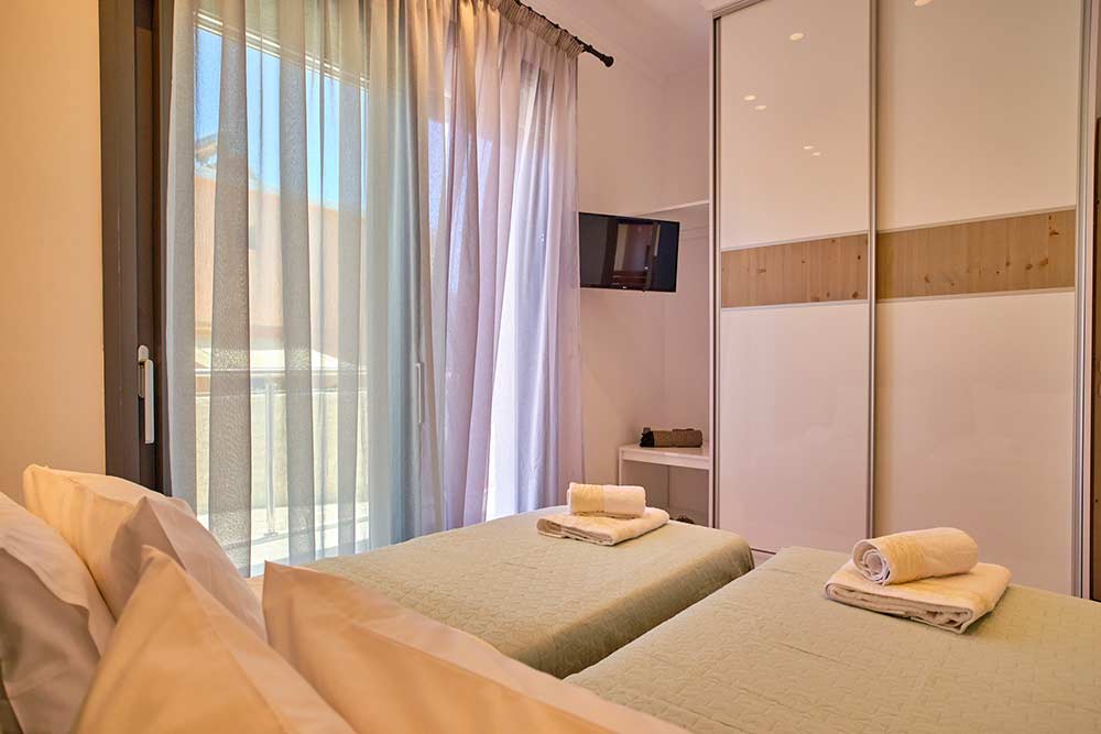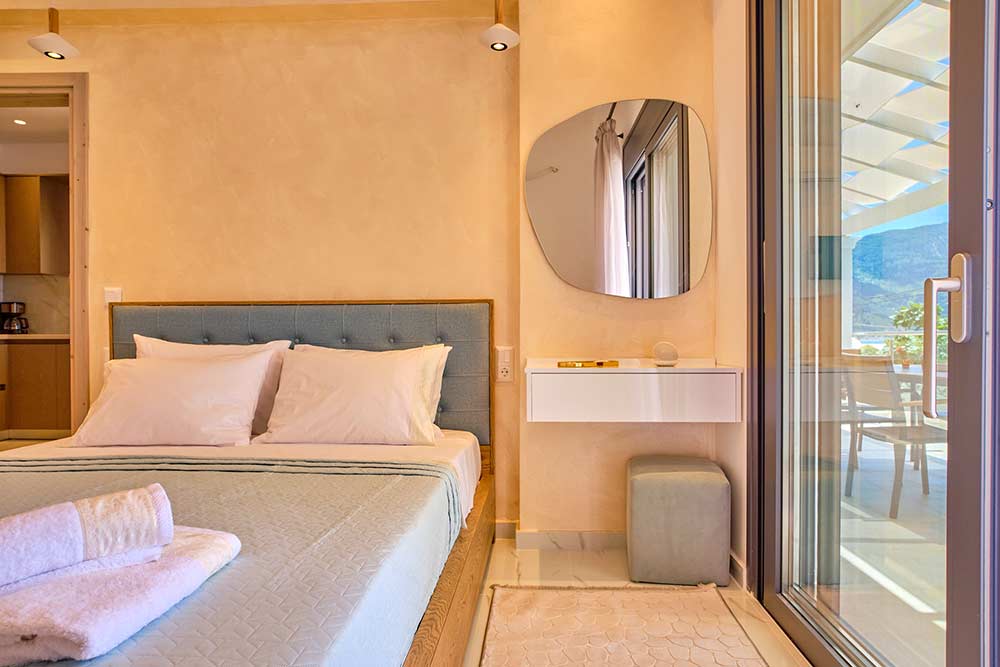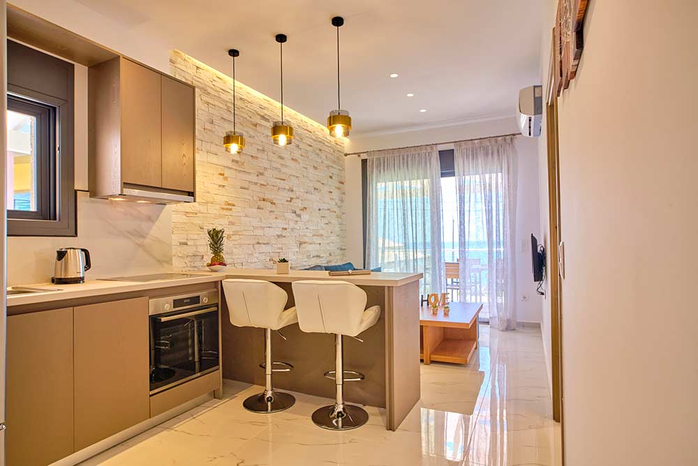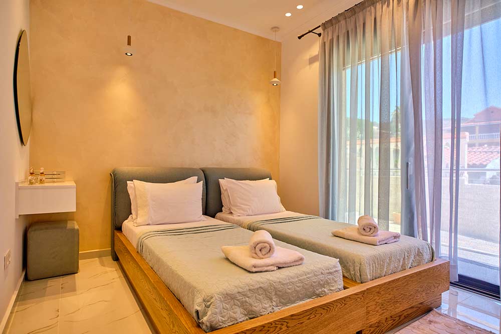 Christos is a ground floor modern furnished suite covering a living space of 60sq.m. Entering the spacious suite there is an open plan kitchen with breakfast- dining bar/ and living room with 43’’Tv.The kitchen is fully equipped with all amenities and electrical appliances: Filter coffee machine, kettle, toastier, hobs and oven, fridge, dishes and utensils as well as microwave and dishwasher. The living room has large glazing doors with access to a balcony with a magnificent view to Agios Georgios Bay. The suite can accommodate 4 guests in two separate bedrooms with en-suite showers. One bedroom features a king size bed, en-suited private shower , Tv, large modern wardrobes , boudoir and access to a balcony with sea view .The second bedroom features two twin beds en-suited private shower and washing machine, Tv, large modern wardrobes , boudoir and access to a balcony. The space is air-conditioned and is accessed from the back of the building by the side of the outdoor shower.