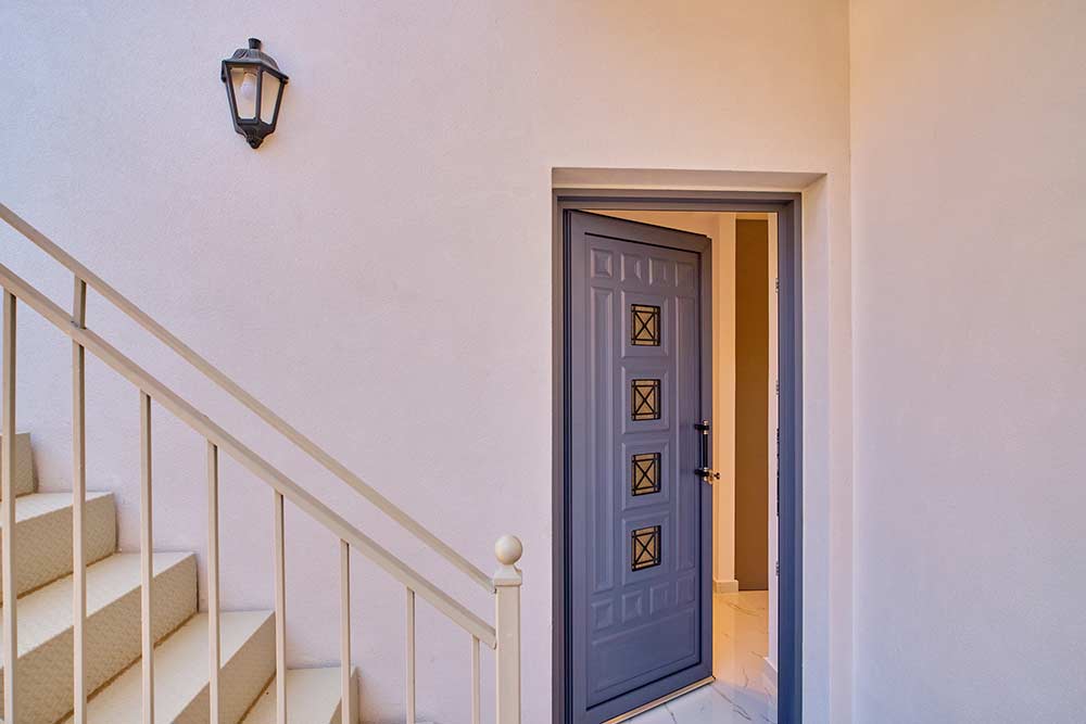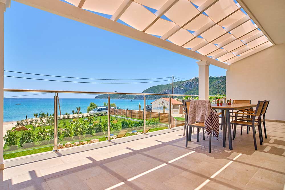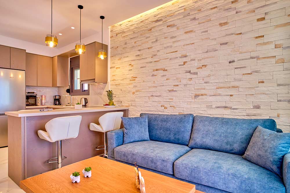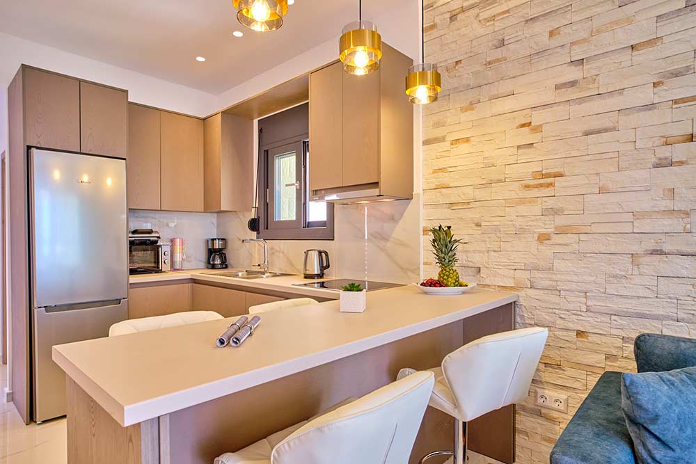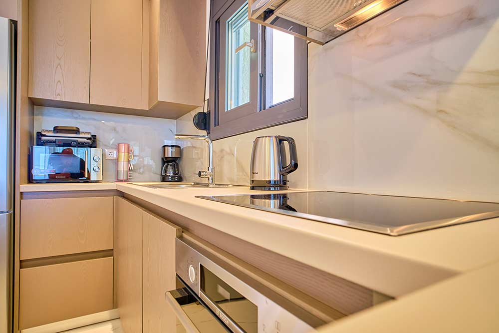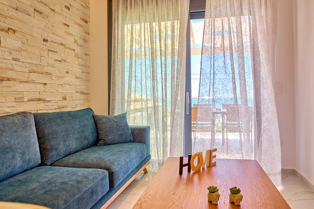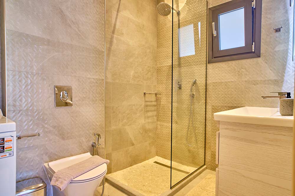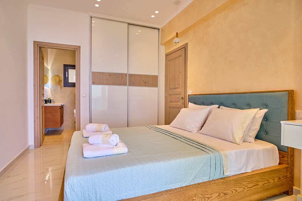 Christos is a ground floor modern furnished suite covering a living space of 60sq.m. Entering the spacious suite there is an open plan kitchen with breakfast- dining bar/ and living room with 43’’Tv.The kitchen is fully equipped with all amenities and electrical appliances: Filter coffee machine, kettle, toastier, hobs and oven, fridge, dishes and utensils as well as microwave and dishwasher. The living room has large glazing doors with access to a balcony with a magnificent view to Agios Georgios Bay. The suite can accommodate 4 guests in two separate bedrooms with en-suite showers. One bedroom features a king size bed, en-suited private shower , Tv, large modern wardrobes , boudoir and access to a balcony with sea view .The second bedroom features two twin beds en-suited private shower and washing machine, Tv, large modern wardrobes , boudoir and access to a balcony. The space is air-conditioned and is accessed from the back of the building by the side of the outdoor shower.