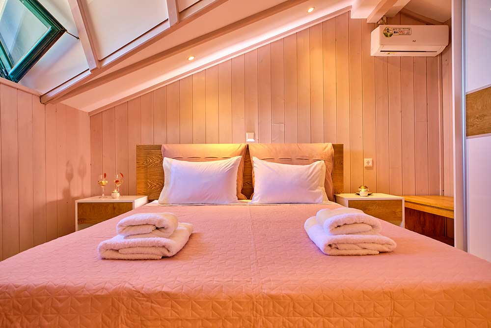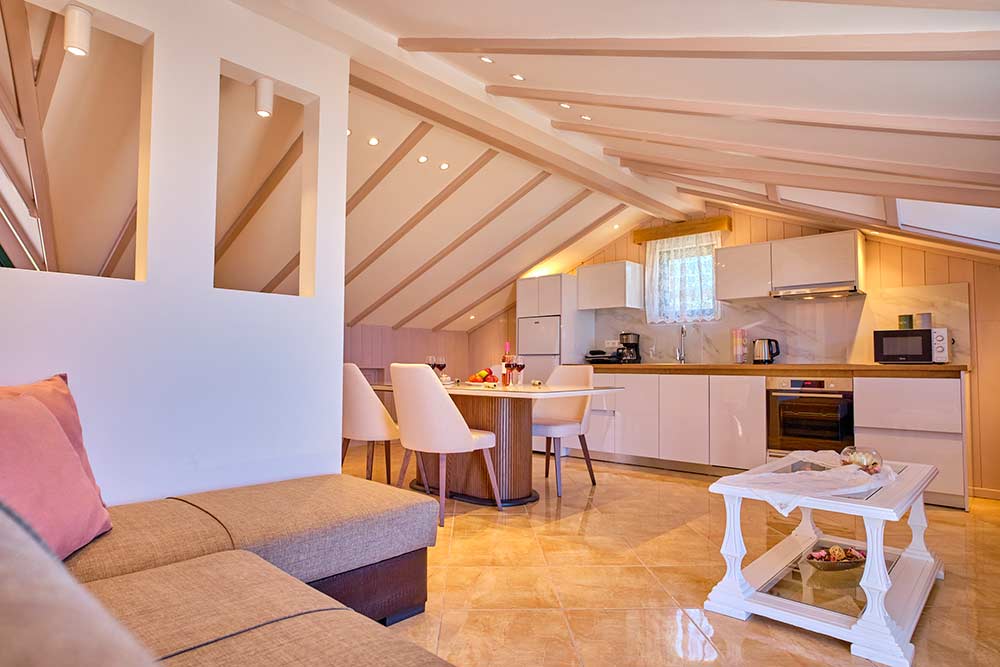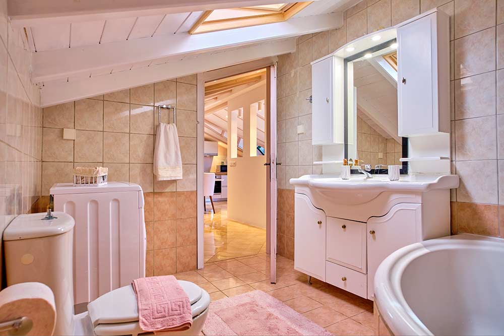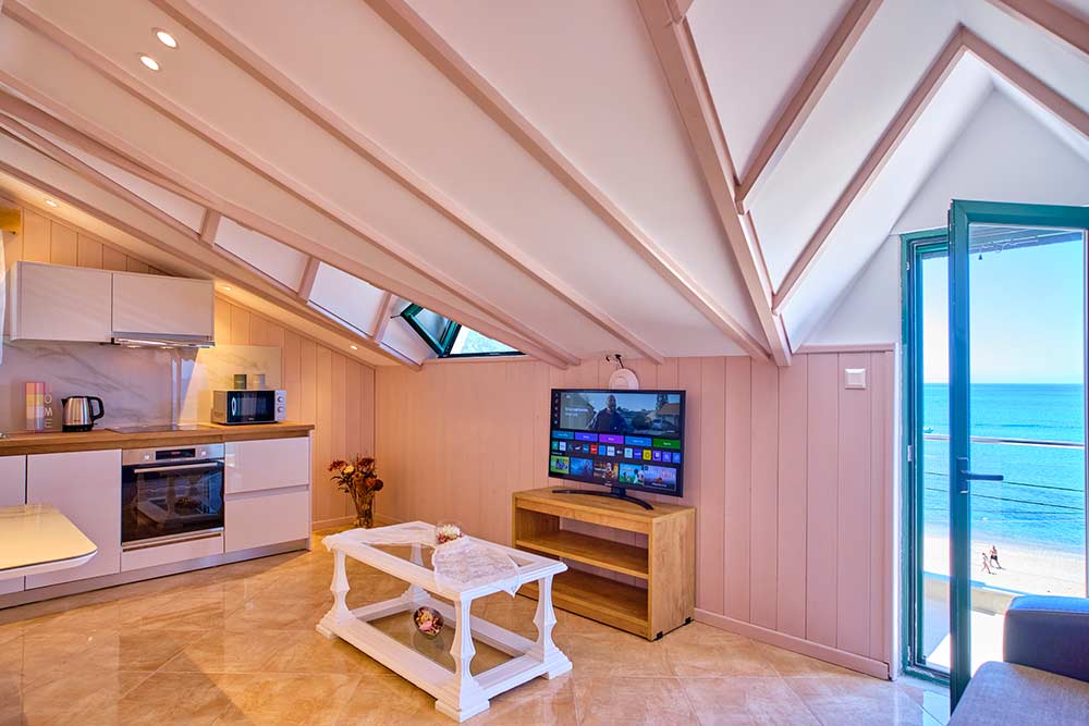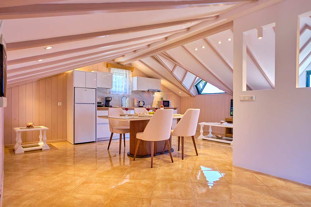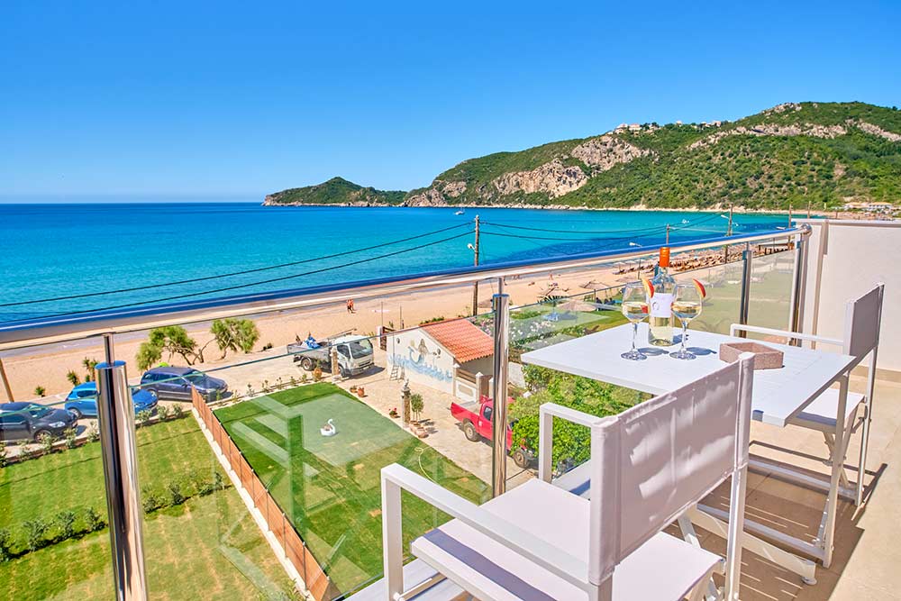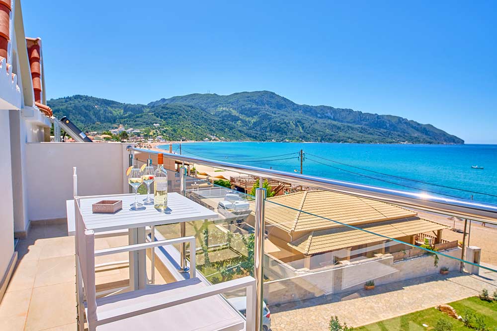 Iliana Loft is a modern furnished suite, set at the second floor, covering a living space of 60sq.m. Entering the spacious loft there is an open plan kitchen with dining area and living room with 43’’Tv.The kitchen is fully equipped with all amenities and electrical appliances: Filter coffee machine, kettle, toastier, hobs and oven, fridge, dishes and utensils as well as microwave and dishwasher. The living room has access to a balcony with a magnificent panoramic view to Agios Georgios Bay. The loft can sleep up to 3 guests in a separate bedroom with a king size bed and the sofa bed in the living room. The bedroom features a king size bed, Tv, large modern wardrobes and boudoir. The space is air-conditioned and features a large bath with washing machine. Iliana Loft is accessed by exterior stairs from the back of the building by the side of the outdoor shower.