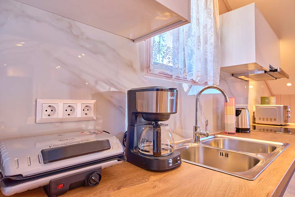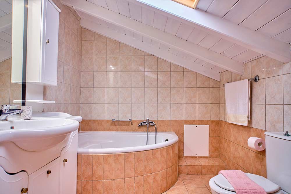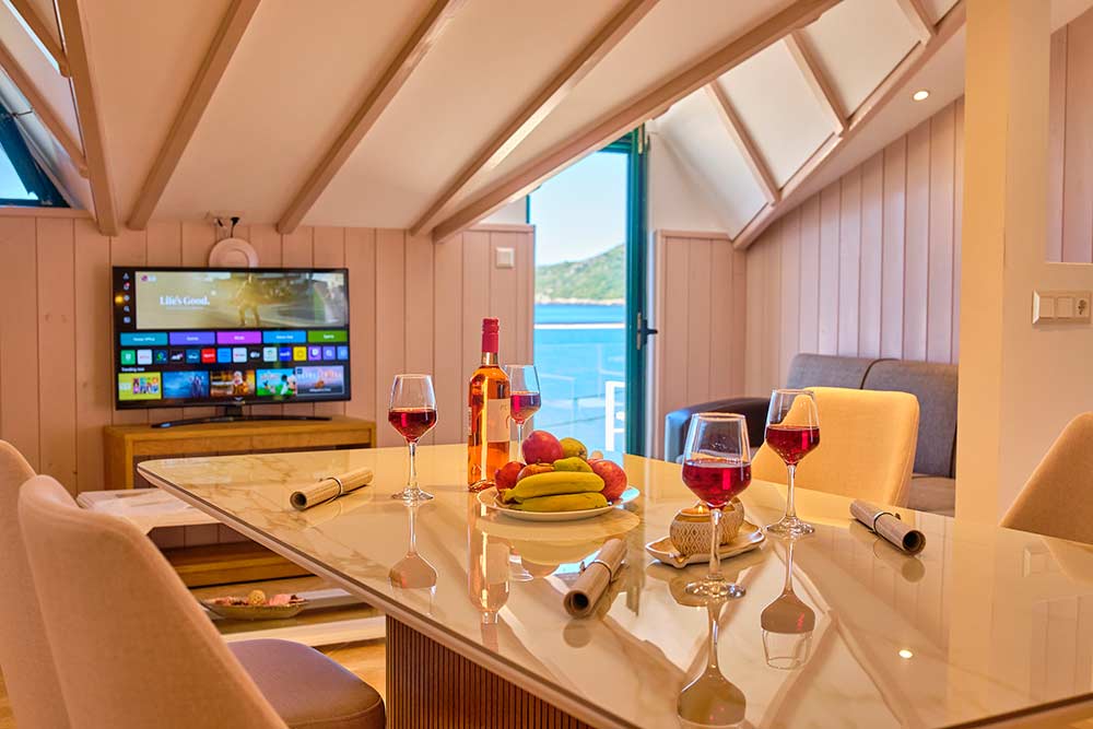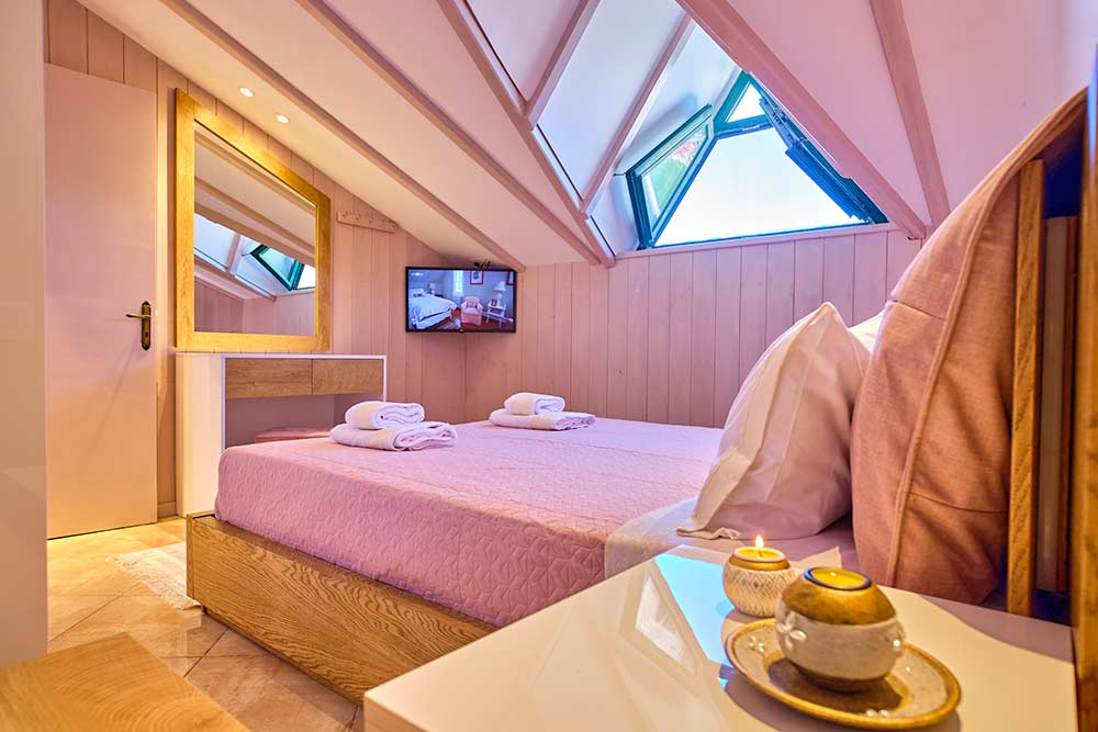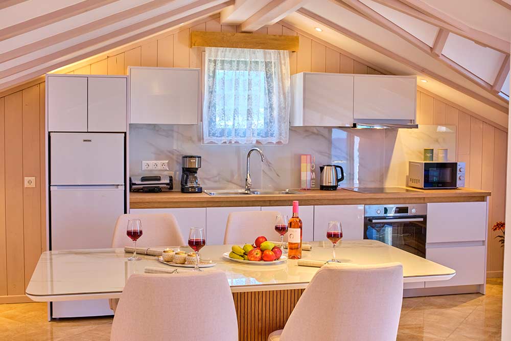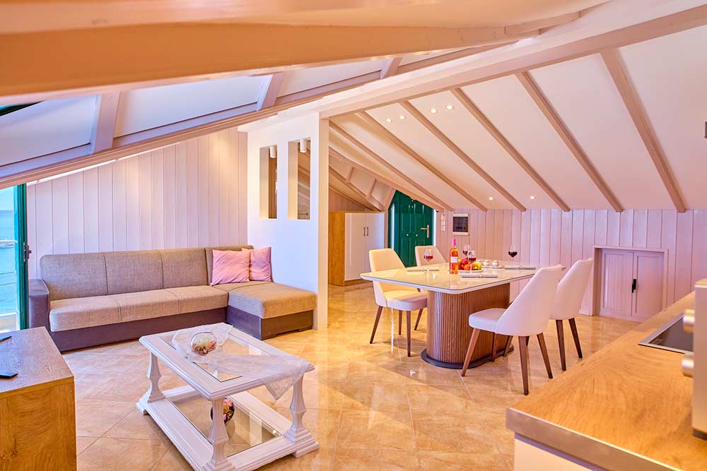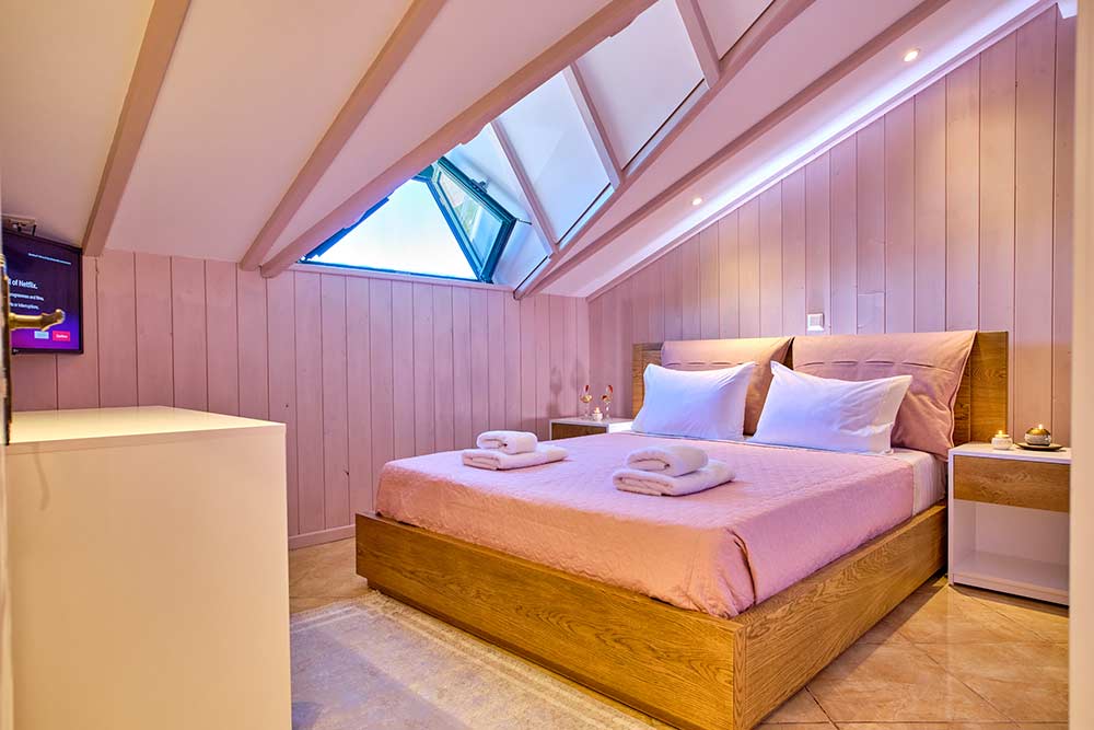 Iliana Loft is a modern furnished suite, set at the second floor, covering a living space of 60sq.m. Entering the spacious loft there is an open plan kitchen with dining area and living room with 43’’Tv.The kitchen is fully equipped with all amenities and electrical appliances: Filter coffee machine, kettle, toastier, hobs and oven, fridge, dishes and utensils as well as microwave and dishwasher. The living room has access to a balcony with a magnificent panoramic view to Agios Georgios Bay. The loft can sleep up to 3 guests in a separate bedroom with a king size bed and the sofa bed in the living room. The bedroom features a king size bed, Tv, large modern wardrobes and boudoir. The space is air-conditioned and features a large bath with washing machine. Iliana Loft is accessed by exterior stairs from the back of the building by the side of the outdoor shower.